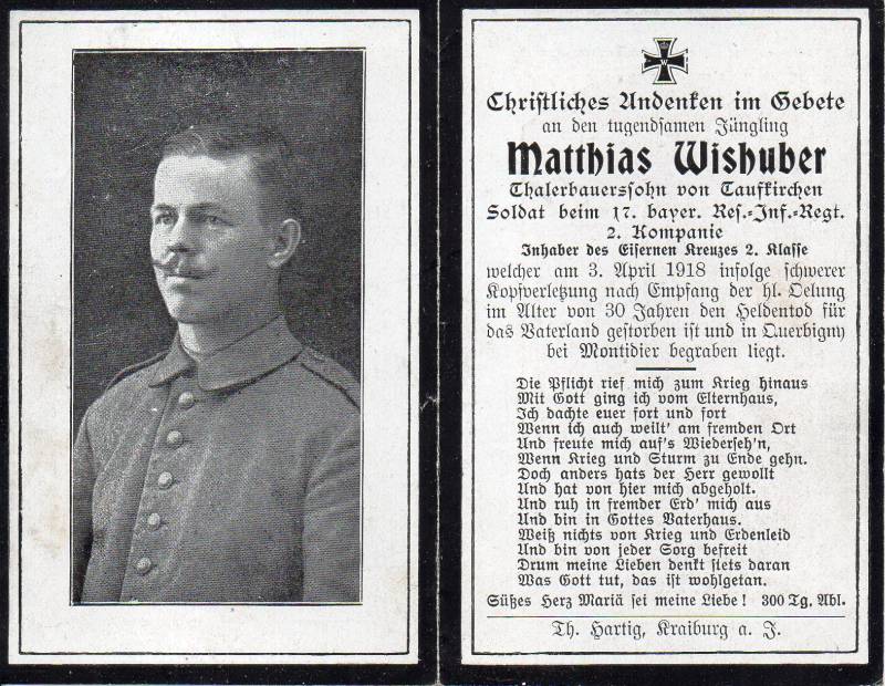 Der Soldat Matthias Wishuber stammte aus Taufkirchen in Bayern. Er war der Sohn eines Landwirts (Thalerbauerssohn).  Im Ersten Weltkrieg kämpfte er als Landsturmmann in der 2. Kompanie des 17. bayerischen Reserve-Infanterie-Regiments. Er wurde mit dem Eisernen Kreuz 2. Klasse ausgezeichnet. Am 03.04.1918 verstarb er im Alter von 30 Jahren an einer schweren Kopfverwundung in der Nähe von Guerbigny bei Montdidier an der Somme.