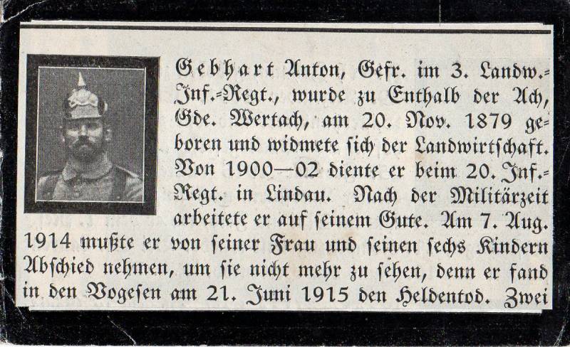 Der Soldat Anton Gebhart wurde am 20.11.1879 in Enthalb der Ach, einem Ortsteil der bayerischen Gemeinde Wertach, geboren. Das Schicksal seines jüngeren Bruder Karl Gebhart stellte ich gestern vor. Er war verheiratet, hatte mit seiner Frau sechs Kinder, und arbeitete als Landwirt. Im Ersten Weltkrieg diente er seit dem 07.08.1914 als Gefreiter in der 8. Kompanie des 3. bayerischen Landwehr-Infanterie-Regiments. Am 21.06.1915 (Sterbebild) oder 23.06.1915 (Volksbund) fiel er im Alter von 35 Jahren am Hilsenfirst in den Vogesen.