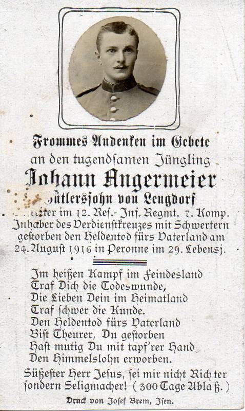 Der Soldat Johann Angermeier wurde am 06.08.1887 in der bayerischen Gemeinde Lengdorf geboren und war der Sohn eines Kleinbauern (Gütlers). Im Ersten Weltkrieg diente er als Gefreiter in der 7. Kompanie des 12. bayerischen Reserve-Infanterie-Regiments. Am 24.08.1916 fiel er im Alter von 29 Jahren bei Peronne.