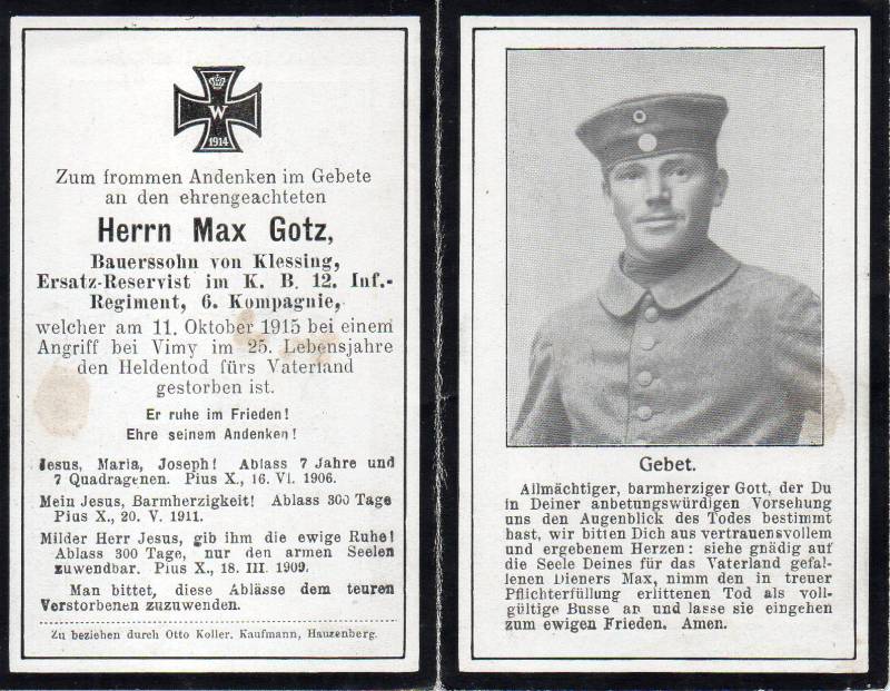 Der Soldat Max Gotz stammte aus der bayerischen Gemeinde Klessing und war der Sohn eines Landwirts. Im Ersten Weltkrieg diente er als Ersatz-Reservist in der 6. Kompanie des 12. bayerischen Infanterie-Regiments. Am 11.10.1915 fiel er im Alter von 24 Jahren bei Vimy bei den Kämpfen um Arras.