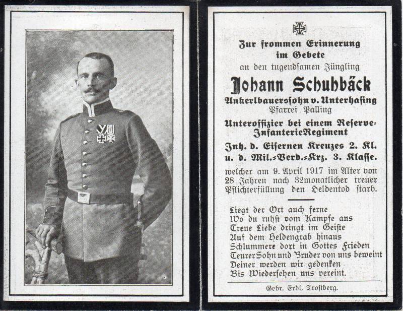 Der Soldat Johann Schuhbäck wurde am 09.05.1889 in Unterhafing, einem Ortsteil der bayerischen Gemeinde Palling, geboren. Seit Vater war Landwirt (Ankerlbauer). Im Ersten Weltkrieg kämpfte er als Unteroffizier in der 12. Kompanie des 1. bayerischen Reserve-Infanterie-Regiments. Er wurde mit dem Eisernen Kreuz 2. Klasse und mit dem Militär-Verdienstkreuz 3. Klasse ausgezeichnet. Am 09.04.1917 fiel er nach 28 Monaten Kriegsdienst im Alter von 27 Jahren bei Arras, auf der Höhe von Vimy, westlich von Bailleul. Ihnen gegenüber standen britische Truppen.