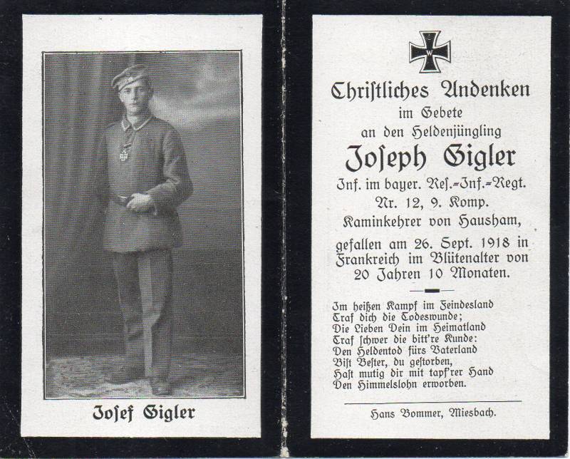 Der Soldat Joseph Gigler wurde am 04.11.1897 Oberbocksberg geboren und arbeitete als Kaminkehrer in Hausham. Im Ersten Weltkrieg diente er als Infanterist in der 9. Kompanie des 12. bayerischen Reserve-Infanterie-Regiments. Am 26.09.1918 fiel er im Alter von 20 Jahren während der letzten Kämpfe vor Verdun in Frankreich. Er wurde bei der Ortschaft Brieulles-sur-Meuse getötet.