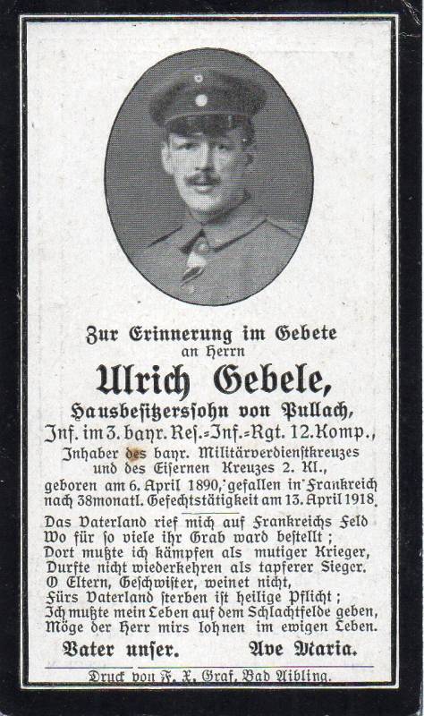 Der Soldat Ulrich Gebele wurde am 06.04.1890 in Pullach, einem Ortsteil der bayerischen Stadt Kolbermoor, als Sohn eines Hausbesitzers geboren. Im Ersten Weltkrieg diente er als Infanterist in der 12. Kompanie des 3. bayerischen Reserve-Infanterie-Regiments. Er wurde mit dem bayerischen Militärverdienstkreuz und mit dem Eisernen Kreuz 2. Klasse ausgezeichnet. Am 13.04.1918 fiel er nach 38 Monate Kriegsdienst im Alter von 28 Jahren in Frankreich während der Schlacht bei Armentières.