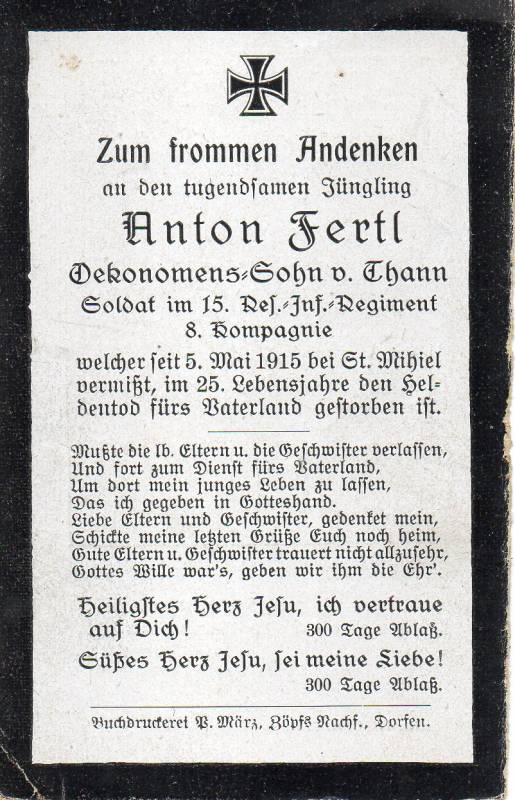 Der Soldat Anton Fertl stammte aus Thann, einem Ortsteil der bayerischen Gemeinde Lengdorf, und war der Sohn eines Landwirts. Im Ersten Weltkrieg diente er als Infanterist in der 8. Kompanie des 15. bayerischen Reserve-Infanterie-Regiments. Am 05.05.1915 fiel er im Alter von 24 Jahren bei Saint-Mihiel.