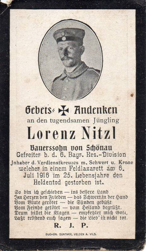 Der Soldat Lorenz Nitzl wurde am 13.07.1891 in Schönau geboren, einem Ortsteil der bayerischen Gemeinde Kröning, und war der Sohn eines Landwirts. Im Ersten Weltkrieg kämpfte er als Gefreiter in der 9. Kompanie des 16. bayerischen Reserve-Infanterie-Regiments, dem Regiment, in dem auch Adolf Hitler kämpfte. Er wurde mit dem Verdienstkreuz mit Schwertern und Krone ausgezeichnet. Am 06.07.1916 verstarb er nach schwerer Verwundung am 01.07.1916 bei Fromelles im Alter von 24 Jahren in einem Feldlazarett in Nordfrankreich.