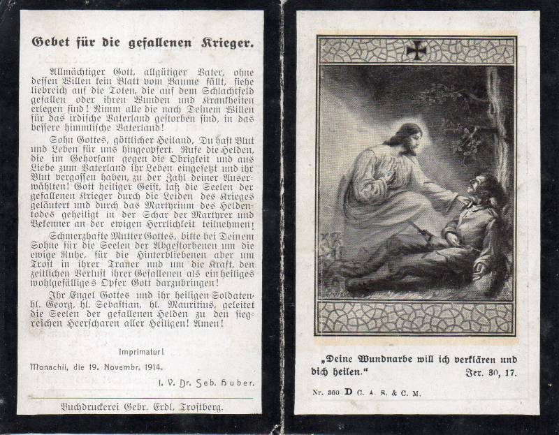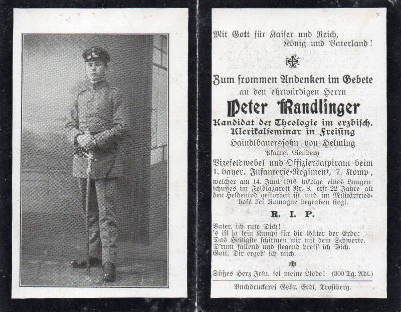 Der Soldat Peter Randlinger stammte aus Helming, einem Ortsteil der bayerischen Gemeinde Kienberg. Sein Vater war Landwirt (Haindlbauer). Er war Kandidat der Theologie im erzbischöflichen Klerikerseminar in Freising, also angehender Priester. Im Ersten Weltkrieg diente er als Vizefeldwebel und Offiziersaspirant in der 7. Kompanie des 1. bayerischen Infanterie-Regiments. Am 14.06.1916 verstarb er im Alter von 22 Jahren im Feldlazarett Nr. 8 in Romagne-sous-les-Côtes