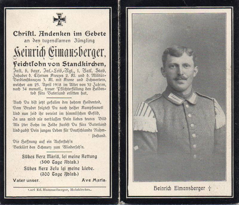 Der Soldat Heinrich Eimansberger wurde am 20.02.1886 geboren und stammte aus Standkirchen, einem Ortsteil der bayerischen Gemeinde Weyarn, und war der Sohn eines Landwirts (Feichtsohn). Im Ersten Weltkrieg kämpfte er als Infanterist in der 3. Kompanie des bayerischen Infanterie-Leib-Regiments (die Angabe auf dem Sterbebild, er sei im Stab des I. Bataillons eingesetzt worden, ist wahrscheinlich falsch). Er wurde mit dem Eisernen Kreuz 2. Klasse und mit dem bayerischen Militär-Verdienstkreuz 3. Klasse mit Krone und Schwertern ausgezeichnet. Am 25.04.1918 fiel er im Alter von 32 Jahren nach 34 Monaten Kriegsdienst während der Schlacht um den Kemmelberg.