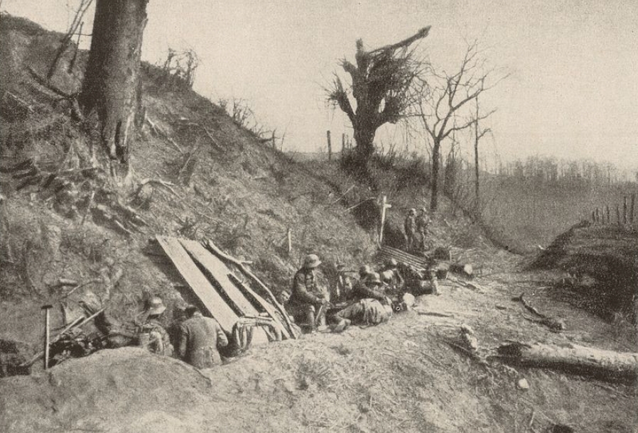Seit etwa 9 Uhr vormittags haben sich am Kemmel Nordwesthang, dann auch um die Schlucht hinter dem Kleinen Kemmel die schwersten Kämpfe, die nur von schwachen und vereinzelt fechtenden Zügen der 5., 11. und 4. Kompanie getragen werden, abgespielt. Der Zug Mooseder der 11. Kompanie hat um 8.30 Uhr von seinem Bataillonskommandeur, Major Graf Bothmer, den Auftrag bekommen, gegen Maschinengewehr-Nester am Kemmel-Nordwesthang vorzugehen. Zug Strauch der 4. Kompanie, die beim Gipfel als Sicherungstruppe zurückgeblieben ist, greift dann auch unterstützend ein, und in scharfem Feuerkampf lässt sich nun allmählich der Wald von einer großen Zahl von Widerstandsnestern säubern. Unteroffizier Haugg der 4. hat mit seinem leichten Maschinengewehr daran besonders rühmlichen Anteil. Auch französische Reserven, die mit Front nach Süden an den Hängen des Kleinen Kemmel bereit liegen, können außerordentlich wirksam mit Feuer gefasst werden, und Gegenangriffe, die Franzosen und Engländer aus den Stollenausgängen heraus immer wieder versuchen, lassen sich mühsam abwehren. Bei einem solchen Gegenangriff fällt Leutnant der Reserve Müller der 4. Kompanie. – Ein Zug der 5. mit einer Maschinengewehr-Gruppe der 6. Kompanie unter Leutnant der Reserve Maerz ist im untersten Drittel des Kemmel nach einigen Kampfaufenthalten bis an den Steilrand vorgekommen, der den Ausgang des Kemmelberges beherrscht. Auch hier kommt es zu heftigstem Feuerkampf, besonders als der Feind um 11 Uhr vormittags durch die Schlucht einen verzweifelten Durchbruchsversuch wagt, der im Feuer auf nächster Entfernung blutig zusammenbricht. Gefreiter Obermeier 5./L. und Leiber Laux 6./L. haben mit ihren leichten Maschinengewehren zu diesem Erfolg hervorragend beigetragen. Obwohl die beiden Kampfgruppen nur 2 – 300 Meter von einander entfernt fechten, bemerken sie einander nicht und halten sich für allein und ohne Unterstützung im Umfassungsangriff. Der Buschwald, der vollkommen zerhackt und zertrichtert die Abhänge deckt und eine Übersicht nur auf allernächste Entfernung erlaubt, und der andauernde gewaltige Feuerlärm, der die Schlucht erfüllt, vermögen es zu erklären, dass 1 ½ Stunden lang die beiden Gruppen ohne Kenntnis voneinander fechten. So entgehen auch den Angreifern einige Maschinengewehre, die oberhalb und bereits hinter ihnen und in gleicher Richtung mit ihnen feuern. Es sind vor allem jene, die dem II./L. das weitere Eindringen in die Blockhauslinie und den Vorstoß über den Sattel unmöglich machten. Bald nach 11 Uhr dringen aber Zug Mooseder und Leutnant der Reserve Maerz endgültig ins Lager ein, Leuchtpistolenschüsse und Handgranatenwürfe in die Stolleneingänge beenden den Widerstand. Zuletzt kapituliert ein von einem französischen Offizier bedientes Maschinengewehr, das am Kemmelwesthang nahe am Gipfel noch feuert, als sich die Lagerbesatzung bereits ergeben hat, etwa um 11.30 Uhr vormittags. An Gefangenen wurden im Stollenlager gezählt: ein französischer Oberst, ein englischer Oberst und Brigadeur, 38 weitere englische und französische Offiziere, an die 400 Mann. II./L. hat nun endlich freie Bahn, tritt sofort den Vormarsch an und ordnet seine im Gefecht stark durcheinander´gewürfelten Einheiten. Um 12.30 Uhr nachmittags ist es zwischen Burggravehof und den Lagern von Brulooze versammelt und hinter III./L. bereitgestellt. Der Frontschutz des eigenen Artilleriefeuers liegt feindwärts der Bahnlinie und der Barackenlager, die III./L. mit seinen drei Kompanien erster Linie besetzt hält; der Anschluss an das Jäger-Regiment 2 rechts und bayerisches 5. Infanterie-Regiment links besteht. Vom Feinde sind nurmehr einige Postierungen zu erkennen, und auch sein Artilleriefeuer beschränkt sich auf einige Schüsse aus Feldkalibern im Raume vorwärts des Kemmel. Sein Fernfeuer hinter den Kemmel scheint wesentlich heftiger zu sein. Das I./L. sammelt am Nordwesthang des Kleinen Kemmel, auf dem sich auch Jäger-Regiment 1 bereitlegt.
