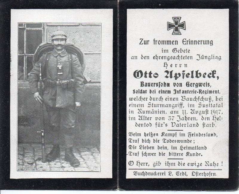 Der Soldat Otto Apfelbeck stammte aus Gergweis, einem Ortsteil der bayerischen Gemeinde Osterhofen. Im Ersten Weltkrieg diente er als Infanterist in einem bayerischen Infanterie-Regiment. Am 11.08.1917 (Volksbund: 12.08.1917) fiel er im Alter von 37 Jahren im Susitatal (Rumänien) durch einen Bauchschuss.