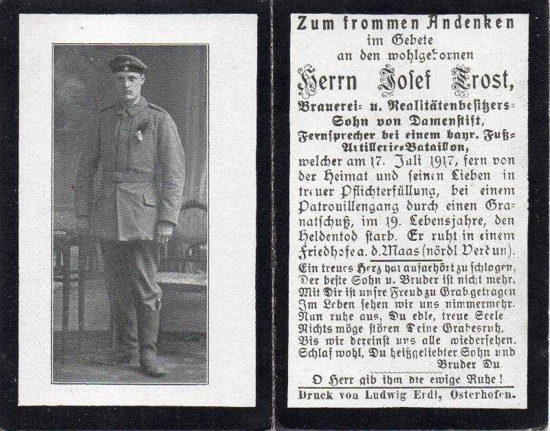 Der Soldat Josef Trost stammte aus Altenmarkt, einem Ortsteil der bayerischen Stadt Osterhofen, und war der Sohn eines Brauerei- und Realitätenbesitzers. Im Ersten Weltkrieg diente er in der 2. Batterie des 20. bayerischen Fußartillerie-Bataillons als Kanonier und Fernsprecher. Am 17.07.1917 fiel er im Alter von 18 Jahren während eines Patrouillengangs östlich Cuisy bei Verdun durch einen Granatschuss.