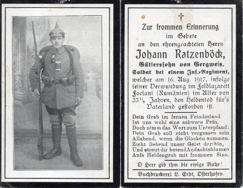 Der Soldat Johann Ratzenböck wurde am 15.02.1894 in Gergweis geboren, einem Ortsteil der bayerischen Gemeinde Osterhofen. Im Ersten Weltkrieg diente er als Infanterist in einem bayerischen Infanterie-Regiment. Am 16.08.1917 verstarb er nach schwerer Verwundung im Alter von 23 Jahren in einem Lazarett in der rumänischen Stadt Focsani.