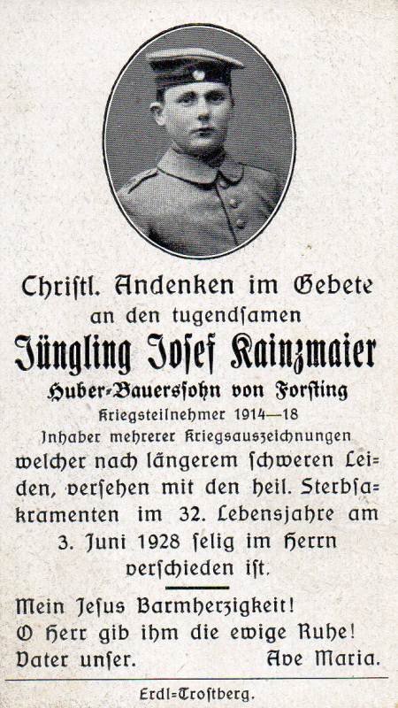Der Soldat Josef Kainzmaier stammte aus Forsting und war der Sohn eines Landwirts. Am 03.06.1928 verstarb er nach langem schweren Kriegsleiden im Alter von 31 Jahren.
