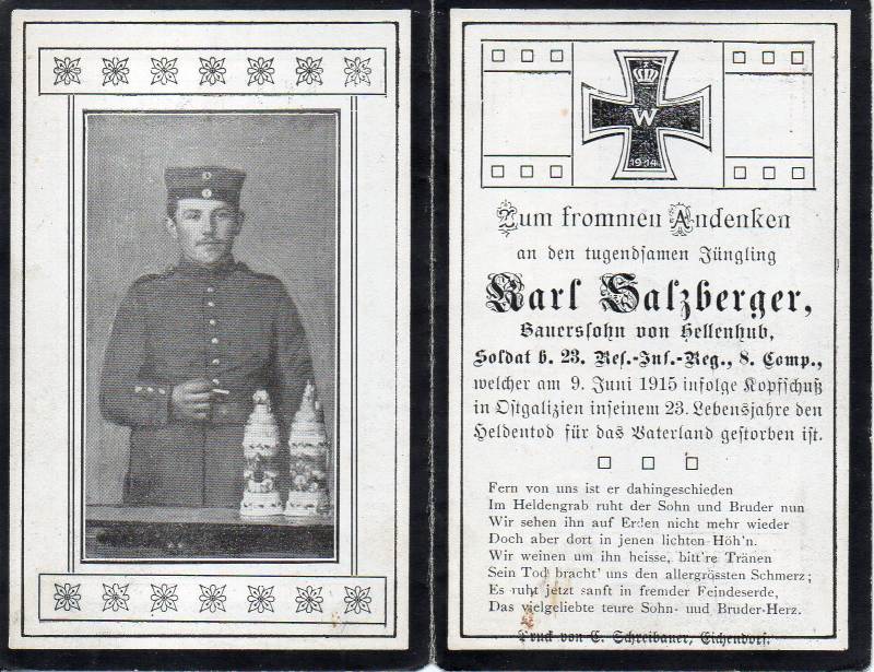 Der Soldat Karl Salzberger stammte aus Hellenhub, einem Ortsteil der bayerischen Gemeinde Eichendorf, und war der Sohn eines Landwirts. Im Ersten Weltkrieg kämpfte er als Infanterist in der 8. Kompanie des 23. bayerischen Reserve-Infanterie-Regiments. Am 09.06.1915 fiel er im Alter von 22 Jahren in Ostgalizien bei Przemysel – Jarosław durch Kopfschuss.