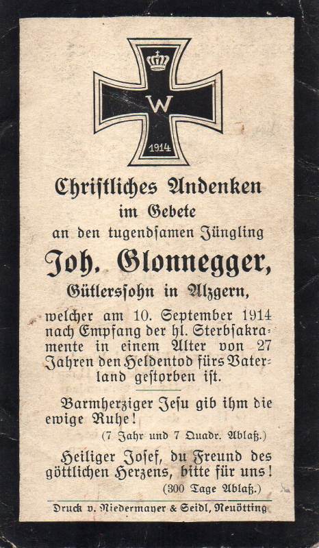 Der Soldat Johann Glonegger stammte aus Alzgern, einem Ortsteil der bayerischen Stadt Neuötting, und war der Sohn eines Kleinbauern (Gütler). Im Ersten Weltkrieg diente er als Infanterist in der 1. Kompanie des 2. bayerischen Brigade-Ersatz-Bataillons. Am 10.09.1914 fiel er im Alter von 27 Jahren während der Schlacht vor Nancy-Epinal im Elsass.