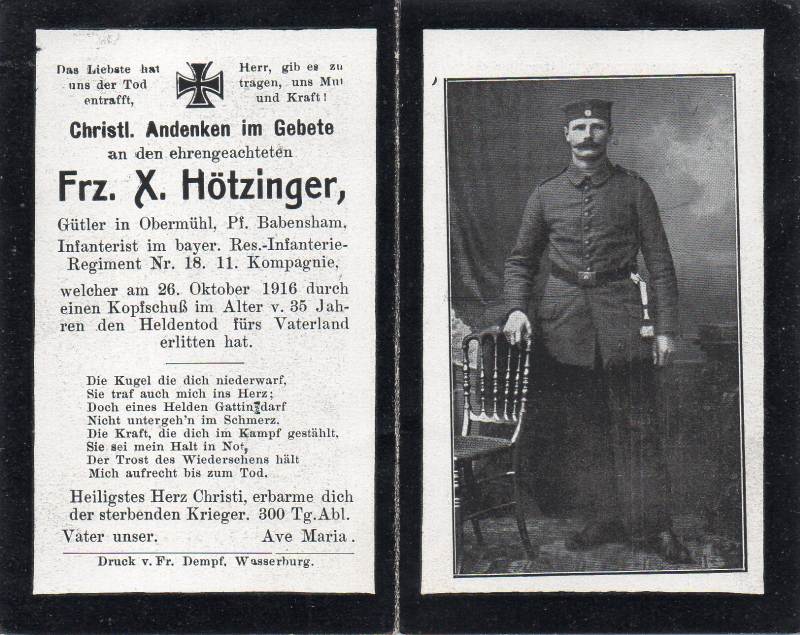 Der Soldat Franz Xaver Hötzinger wurde am 31.12.1881 in Obermühl, einem Ortsteil der bayerischen Gemeinde Babensham, geboren und lebte in Untereichenrott als Kleinbauer (Gütler) Im Ersten Weltkrieg kämpfte er als Infanterist in der 11. Kompanie des 18. bayerischen Reserve-Infanterie-Regiments. Am 26.10.1916 fiel er im Alter von 34 Jahren bei den Gebirgskämpfen am Rother-Thur-Pass in Rumänien durch einen Kopfschuss.