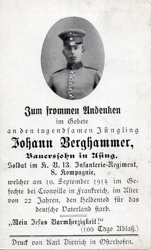 Über den Todestag und die Todesumstände von Johann Berghammer berichtet die Regimentsgeschichte des 13. bayerischen Infanterie-Regiments: