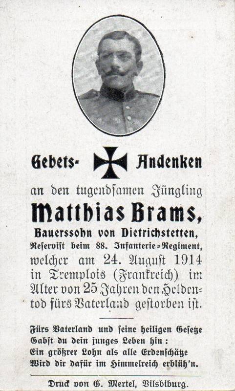 Der Soldat Matthias Brams stammte aus Dietrichstetten, einem Ortsteil der bayerischen Gemeinde Kröning, und war der Sohn eines Landwirts. Im Ersten Weltkrieg dienteb er als Reservist in der 4. Kompanie des 88. Reserve-Infanterie-Regiments. Am 24.08.1914 fiel er während der Schlacht an der Maas im Alter von 25 Jahren bei Tremblois-lès-Carignan.