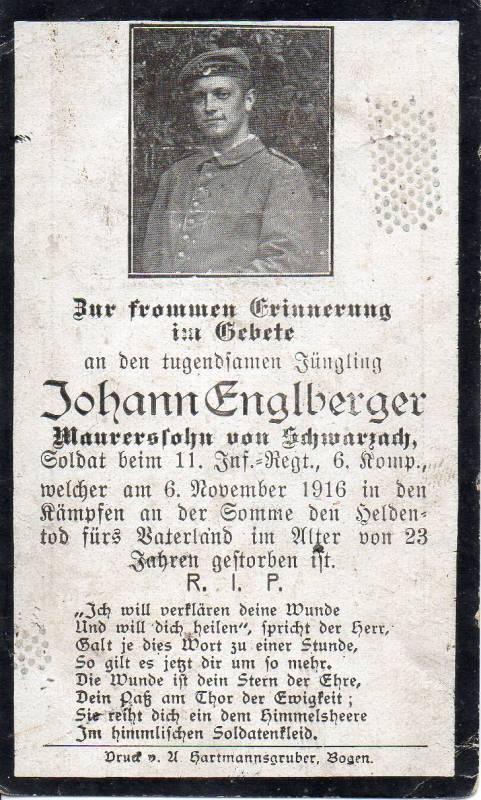 Der Soldat Johann Englberger stammte aus der bayerischen Gemeinde Schwarzach und war der Sohn eines Maurers. Im Ersten Weltkrieg diente er als Infanterist in der 6. Kompanie des 11. bayerischen Infanterie-Regiments. Mitte 1915 wurde er leicht verwundet. Am 06.11.1916 fiel er im Alter von 23 Jahren während der Schlacht an der Somme und den Stellungskämpfen bei La Bassée. Er wurde bei Wavrin getötet.