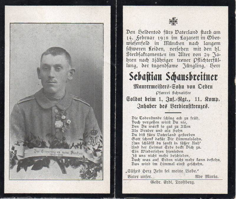 Der Soldat Sebastian Schausbreitner stammte aus Oeden, einem Ortsteil der bayerischen Gemeinde Schnaitsee, und war der Sohn eines Maurermeisters. Im Ersten Weltkrieg kämpfte er als Infanterist in der 11. Kompanie des 1. bayerischen Infanterie-Regiments. Er wurde mit dem bayerischen Verdienstkreuz ausgezeichnet. Am 14.02.1918 verstarb er nach drei Jahren Kriegsdienst im Alter von 29 Jahren im Lazarett Oberwiesenfeld in München nach langem schweren Leiden.