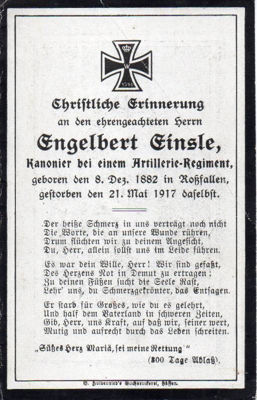Der Soldat Engelbert Einsle wurde am 08.12.1882 in Roßfallen geboren, einem Ortsteil der bayerischen Gemeinde Seeg. Im Ersten Weltkrieg diente er als Kanonier im 6. bayerischen Reserve-Feldartillerie-Regiment. Am 21.05.1917 verstarb er im Alter von 34 Jahren in Roßfallen in Folge einer Krankheit.