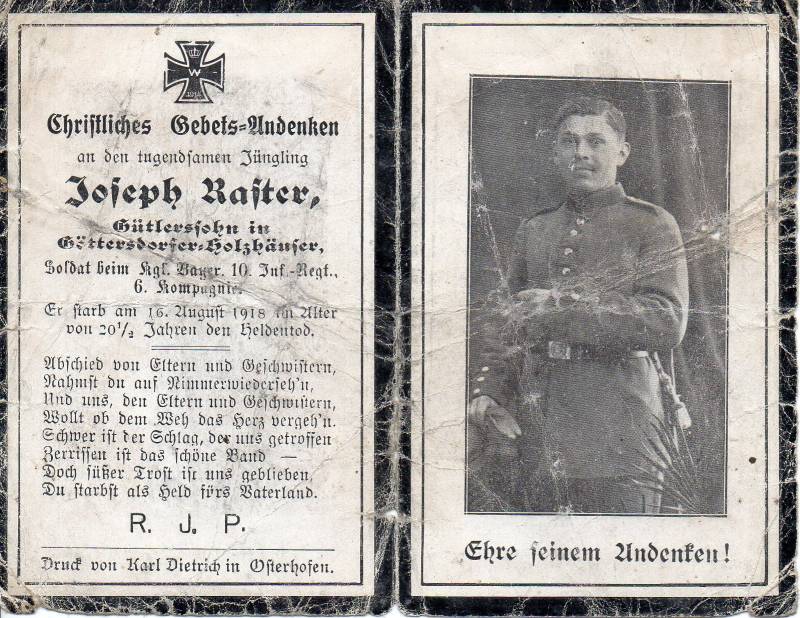 Der Soldat Joseph Raster wurde am 22.03.1898 in Göttersdorfer – Holzhäuser, einem Ortsteil der bayerischen Stadt Osterhofen, und war der Sohn eines Kleinbauern (Gütler). Im Ersten Weltkrieg diente er als Infanterist in der 6. Kompanie des 10. bayerischen Infanterie-Regiments. Am 16.08.1918 fiel er bei Beuvraignes an der Somme im Alter von 20 Jahren.
