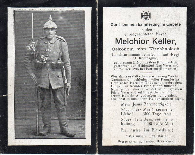 Der Soldat Melchior Keller wurde am 11.11.1880 in der bayerischen Gemeinde Kirchhaslach geboren und war Landwirt. Im Ersten Weltkrieg kämpfte er als Landsturmmann in der 11. Kompanie des 26. bayerischen Infanterie-Regiments. Am 24.12.1916 fiel er im Alter von 36 Jahren während der Weihnachtsschlacht von Rimnicul Sarat bei der Erstürmung der Höhe 417 bei Petrisul in Rumänien.